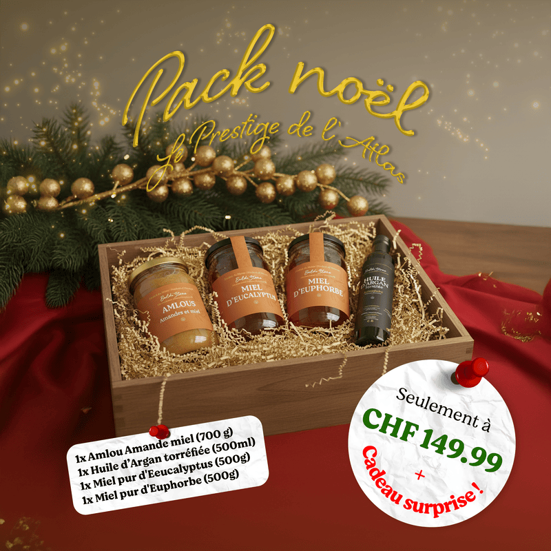 Les Packs Noël Beldi Stone sont des coffrets gourmands haut de gamme mettant à l’honneur le meilleur du terroir marocain. Élaborés avec des produits artisanaux 100 % naturels, nos packs associent miel pur du Maroc, amlou traditionnel et huile d’argan torréfiée, pour une expérience gustative authentique et raffinée.